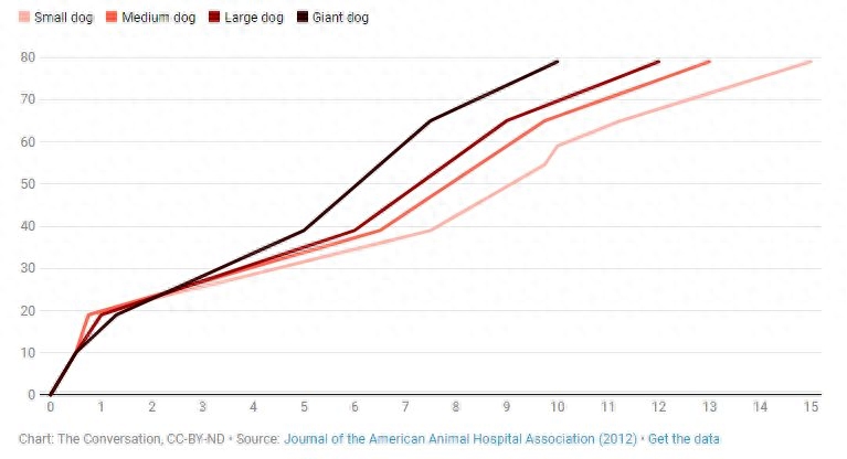 通过结合人类的年龄以及狗的年龄阶段,兽医们便可以估算你的宠物狗的实际年龄了。水平坐标表示自然年龄,垂直坐标表示以人类为标准的实际年龄。由于体型不同的狗预期寿命也不同,所以表格划分为了小型、中型、大型和巨型四种体型,颜色由浅至深。