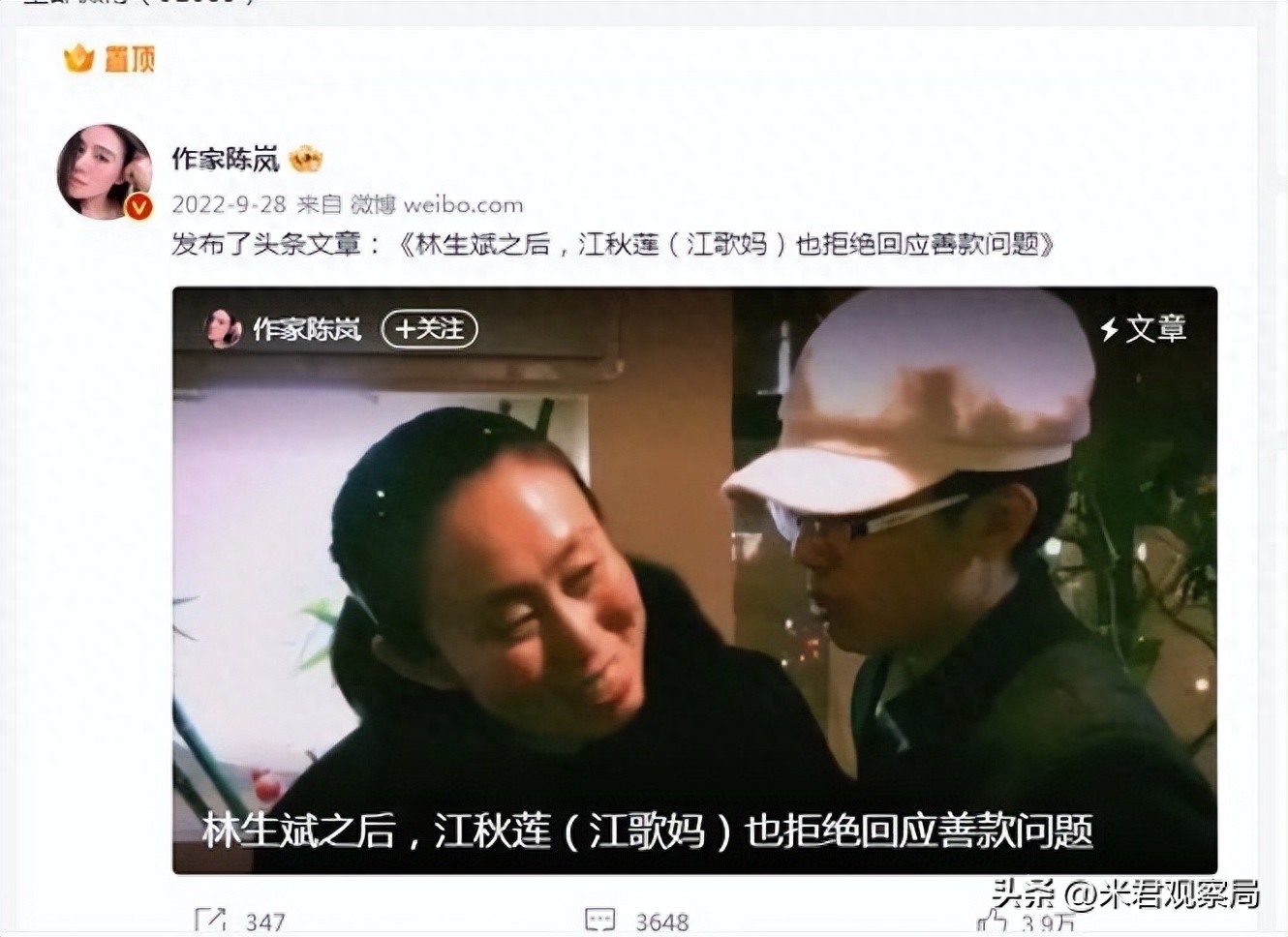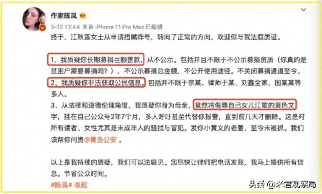 陈岚根本就不在意这件事情的前因后果,不去问刘鑫的恶毒表现,而是把舆论引导向江歌妈妈借捐款敛财以及莫须有的公民信息上。它多次发文,污蔑江妈借助江歌案不合法募捐上百万,并且拿这些钱放高利贷,逼得江妈痛哭,求警方调查自己的资金来源和支出。除此之外,她还质疑江歌妈妈和她的律师,公开引导网暴司法机关。