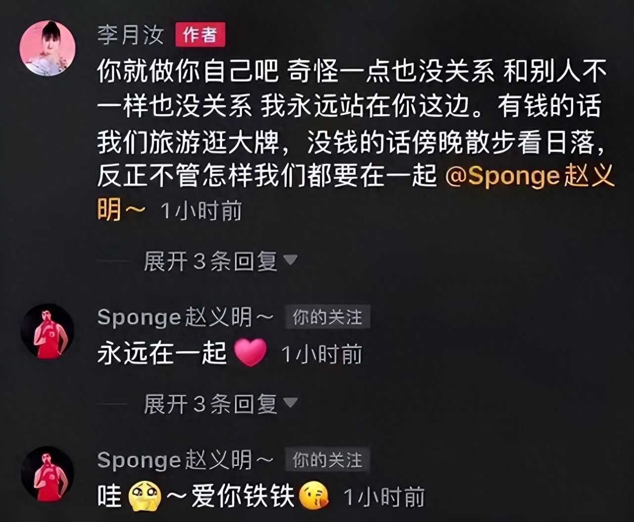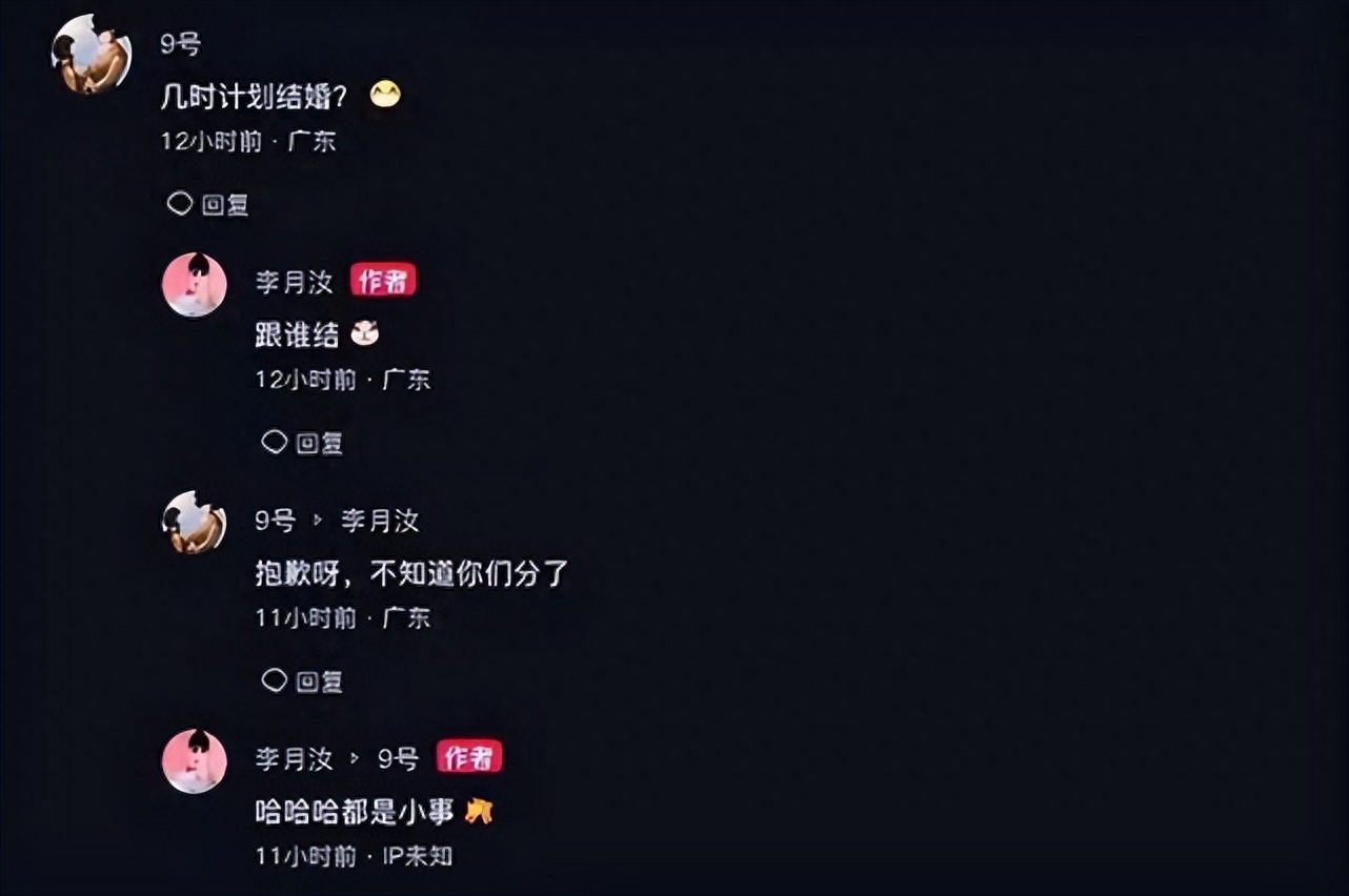 对于外界的这些评价,李月汝选择在社交媒体上多次发声维护自己的男友来作为回应,她说自从和赵义明在一起,她从来没有羡慕过别人。除此之外,李月汝和赵义明也经常在社交媒体上秀恩爱,用一次次甜蜜的合照回击了旁人的议论纷纷。然而就在最近,很多网友却发现李月汝已经在给网友的回复中透露了自己和赵义明分手的消息,并且她还把两人之前的动态给删除了。