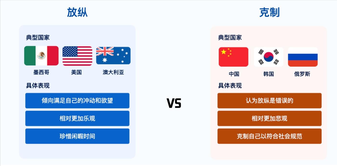 社会成员对人基本需求与享受生活享乐欲望的允许程度。放纵代表着一个社会允许人们相对自由地满足、享受生活;克制社会群体会对自身有较大的约束力。美国的IVR分数为68,代表整体社会是比较放纵享受生活的;中国的IVR分数为24,意味着整体是比较克制的。