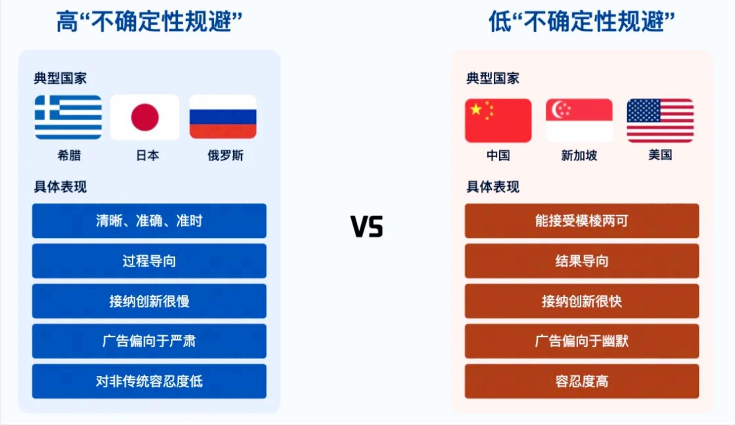 社会对未来不确定性的态度。高不确定性规避的国家保持着严格的信仰和行为准则,不容忍非正统的行为和思想。低不确定性规避的国家则会保持着一种更为宽松的态度,相信实践比原则更重要。日本的UAI分数为92,具有很强的不确定性规避倾向,不喜欢惊喜,认为结构和计划是必需的;中国在UAI分数为30,具有较低的不确定性规避倾向,信奉实用主义,认为真理是相对的,法律和规则也是灵活的。