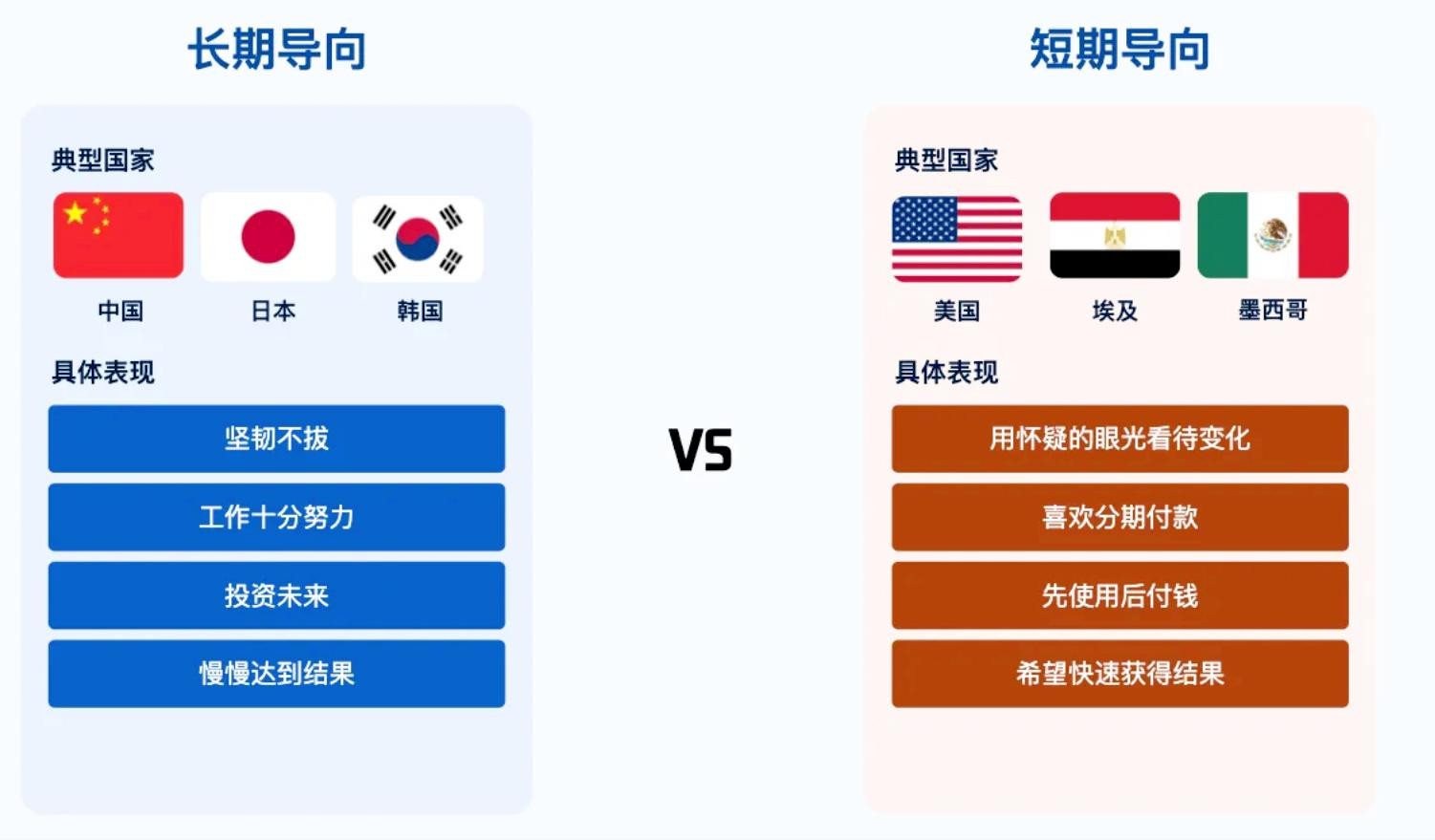 文化中的成员对延迟其物质、情感、社会需求的满足所能接受的程度。长远导向的社会群体有更强的毅力和韧性,短期导向注重保守稳定,追求及时行乐。美国的LTO分数为26,分数较低,短期导向,当前消费,今朝有酒今朝醉;中国的LTO分数为87,分数较高,有强烈的储蓄投资倾向,坚持长期主义。