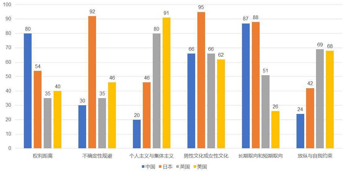 通过权力距离、个人主义、男性文化、不确定性规避、长期导向、放纵6个维度进行打分,旨在揭示不同国家与地区文化上的差异。每个维度的分值从0到100,50为中等水平,如果得分低于50,文化在该量表上的得分相对较低,如果得分超过50,文化在该量表上的得分较高,越高说明该特性越强。