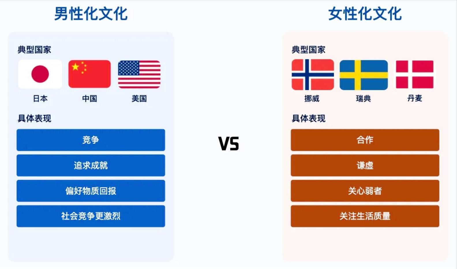 文化中是男性还是女性更占主导地位。指标越高说明该社会的男性化倾向越明显,反之则说明女性主导更突出。日本的MAS分数为95,分数较高,典型的男性文化,地位高同时高度竞争的男性社会;中国的MAS分数为66,也体现了男性文化,以成功为导向,如狼性文化、996。