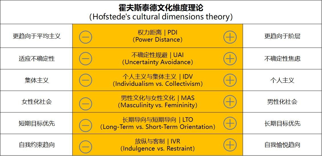 霍夫斯泰德文化维度理论是荷兰心理学家吉尔特·霍夫斯泰德提出用来衡量不同国家文化差异的一个框架。六个维度分别是权力距离(Power Distance)、不确定性规避(Uncertainty Avoidance)、个人主义与集体主义(Individualism vs. Collectivism)、男性文化与女性文化(Masculinity vs. Femininity)、长期导向和短期导向(Long-Term vs. Short-Term Orientation)、放纵与客制(Indulgence vs. Restraint)。