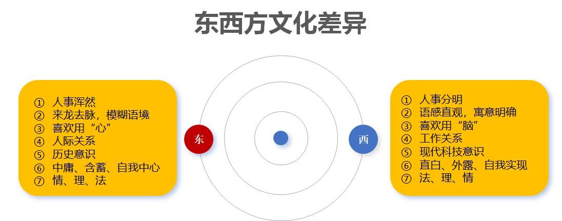 文化是在一个环境下人们共同拥有的心理程序,能将一群人与其他人区分开来,不同文化决定了不同的价值观,影响着人们的日常举止与行事方式,也就形成了东西方文化差异。