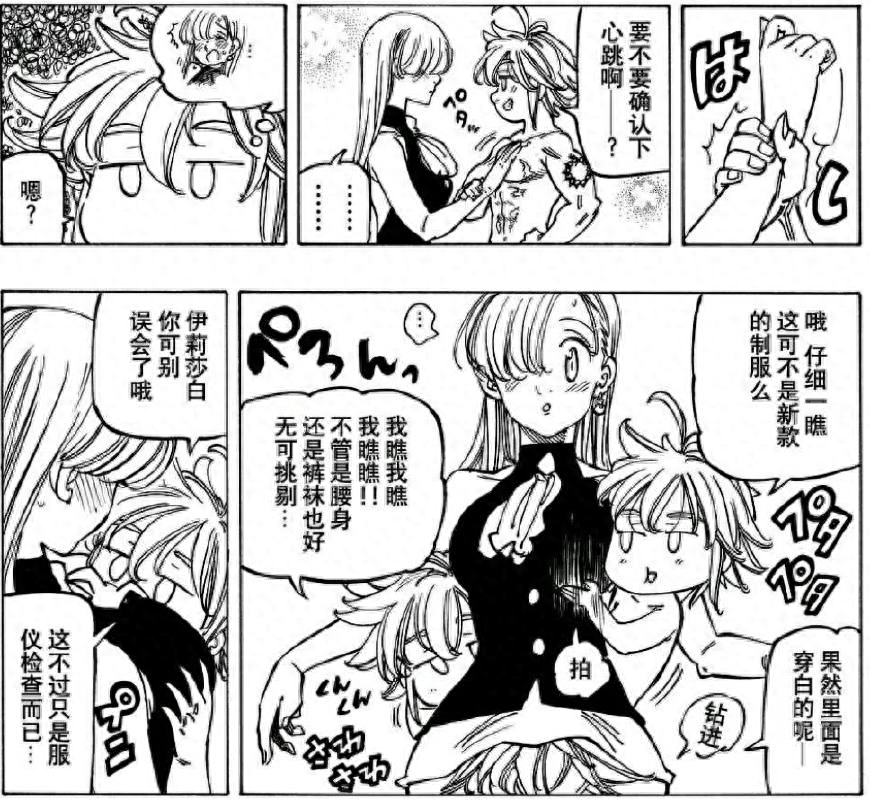 复活过来的团长,见到伊丽莎白穿着新制服,又开始调戏伊丽莎白,美其名曰是为了检查新的制服,让伊丽莎白不要多想。检查制服动动眼睛就行了,梅利奥达斯你怎么动手啊?没想到的是,伊丽莎白竟然毫无抵抗,更是让团长多检查。这伊丽莎白是被开心冲昏了头脑吧。