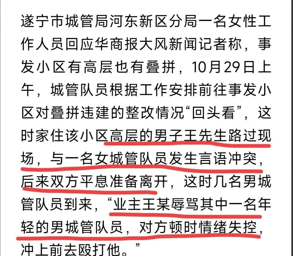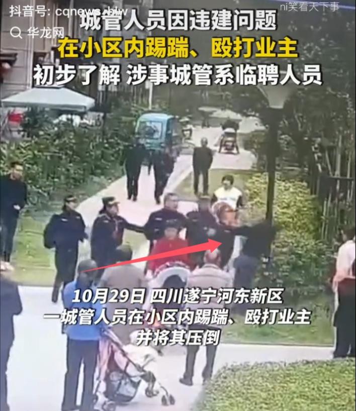 遂宁市城管局河东新区分局的工作人员说,那天上午,城管队员去小区查看违建整改情况。这时,小区的王先生路过,与一名女城管发生了争吵。