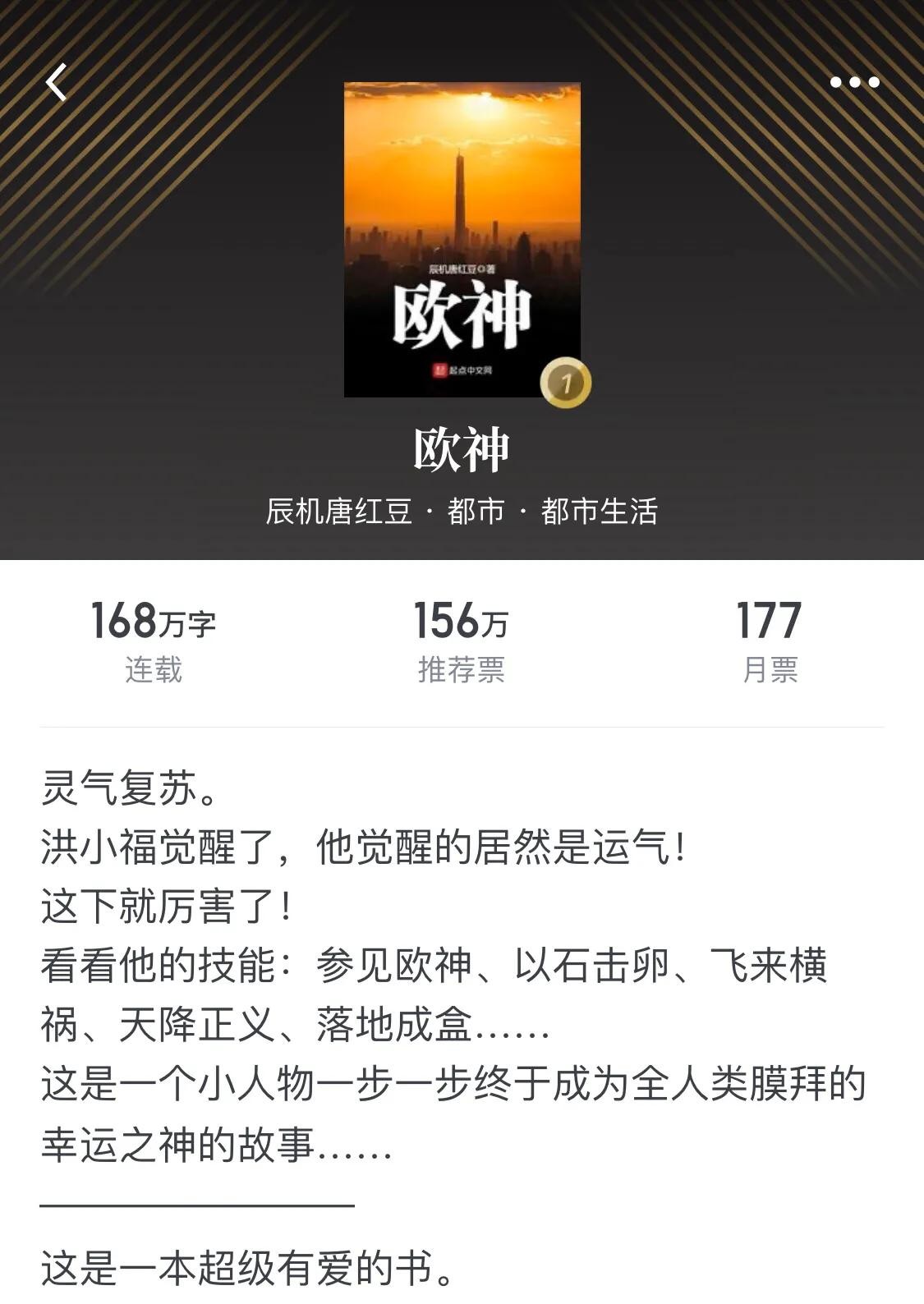 文风轻松,而且主角获得的能力是运气,拜见欧神这个能力超有喜感。写得比较温馨,最重要的是,有正能量!看完之后觉得身上暖暖的,心里也暖暖的。