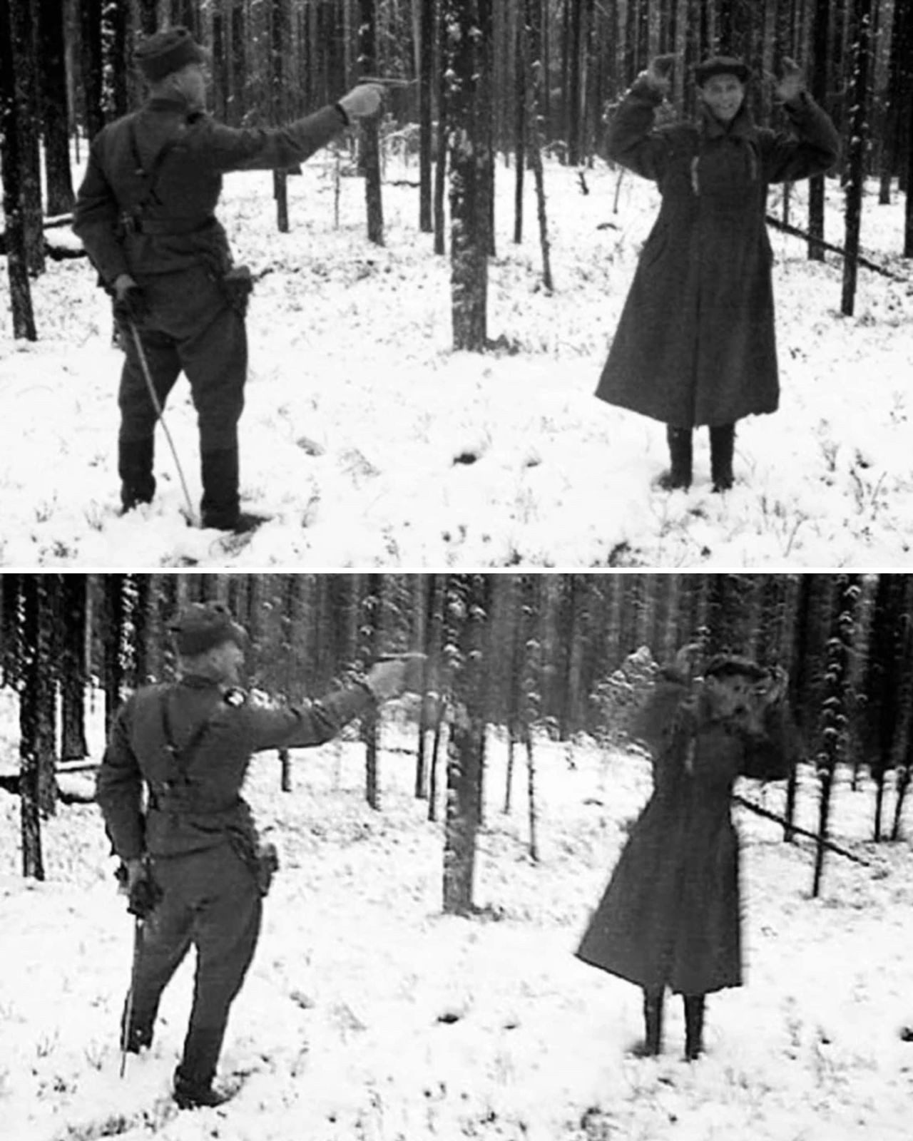 1942年,芬兰,一名苏联间谍在被处决时哈哈大笑,这张照片直到2006年才被解密,因为芬兰人认为这些照片会被亲苏分子用于宣传。
