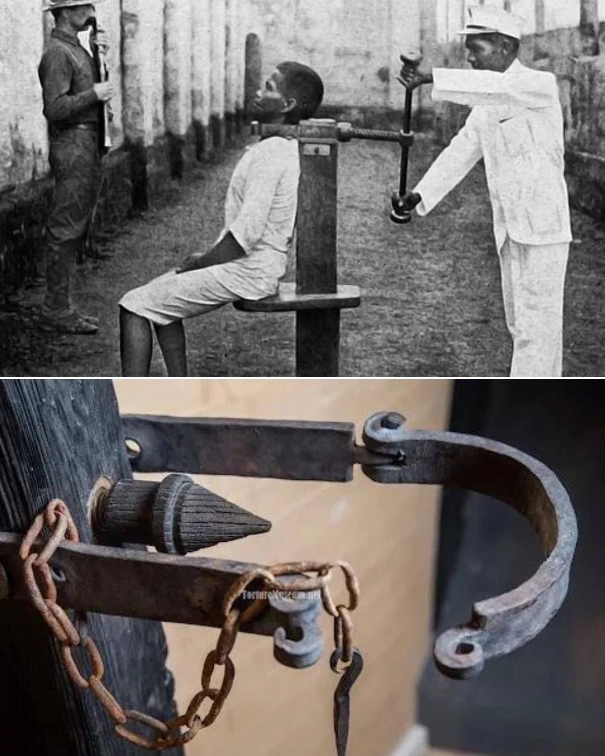 garrote,一种非常残忍的绞刑变种,西班牙人一种用到了1974年,那时死刑都快被废除了,刽子手都不会用这玩意,折腾了半个小时才完成,对人犯可谓是究极折磨…