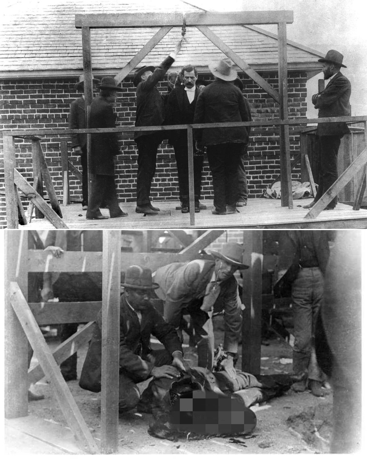 1901年,美国一名火车劫犯在被处以绞刑时,由于绳子太长了,自由落体加速过久后,脑袋和身体分头行动了……这个事迹在当时非常出名,照片还被做成了明信片…