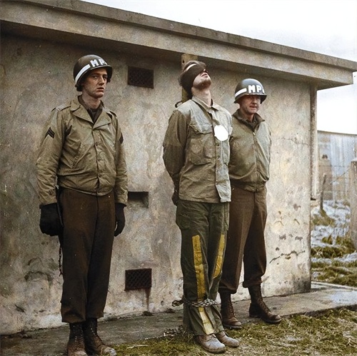 1944年,一名身穿美军制服的德国突击队战俘,被美国行刑队处死…在国际法中,穿敌方制服被俘,那就是间谍,不受日内瓦公约保护了。