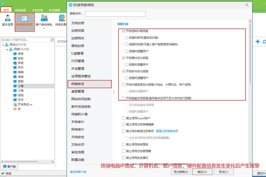 软硬件管理: 当终端电脑硬件配置信息和软件列表发生变化时自动产生报警信息,保护企业资产。
