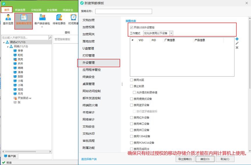 外设管理:设备管理作为项目管理中的核心业务之一,涵盖多个层次。通过开启USB外设管控,可以详细记录外接设备的使用记录。
