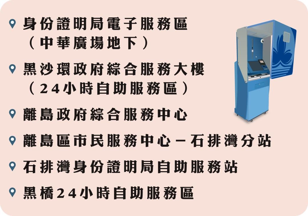 为协助市民更好利用设置在各区的自助服务机,身份证明局亦于上述期间每日早上9时至晚上9时,在全澳6个24小时自助服务区,派专人协助市民办证,提升自助办证的效率。有关24小时自助服务点位置及详情,请参阅