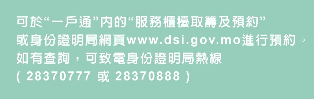 身份证明局呼吁合资格人士优先使用“一户通”或自助服务机电子办证。如有查询,可致电身份证明局热线(+853 2837-0777或+853 2837-0888)或電郵至info@dsi.gov.mo。