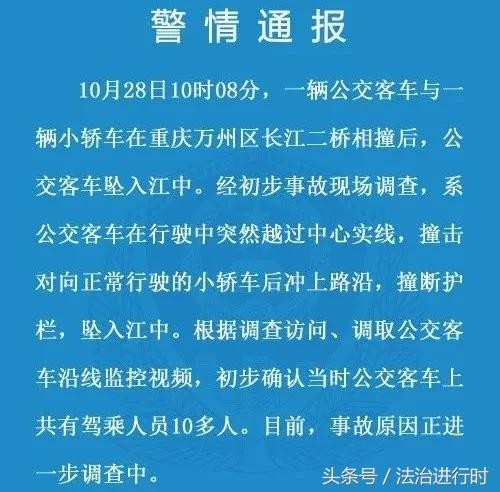 公安部、交通运输部、应急管理部组成联合工作组赴现场协助当地政府开展救援。目前现场有20余艘船舶正开展搜寻救援。经事故现场初步调查,系公交客车在行驶中突然穿过中心实线,撞上对向正常行驶的小轿车后,越过路沿,撞断护栏坠入江中。初步确认当时公交客车上共有驾乘人员10余人。(人民网、@重庆长安网)