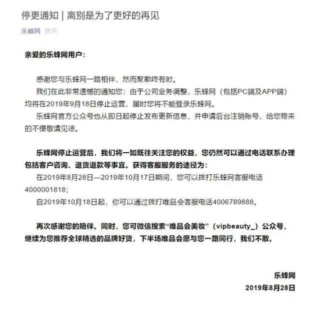 楚天都市报讯 8月28日,乐蜂网通过微信公众号发布停止运营通知,乐蜂网将在2019年9月18日正式停止运营,公众号从即日起不再更新,并进入注销程序。