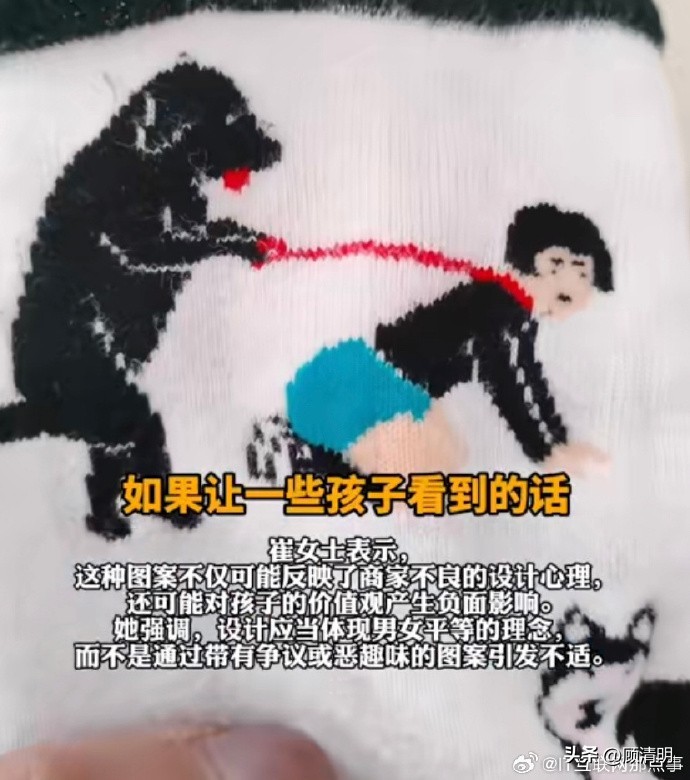 2025年2月11日,安徽阜阳的崔女士因一双朋友赠送的袜子引发舆论关注。这双袜子的图案设计为"狗牵着女性",崔女士认为该设计存在性别歧视倾向,可能对儿童价值观造成不良影响,并强调商品设计应体现男女平等理念。