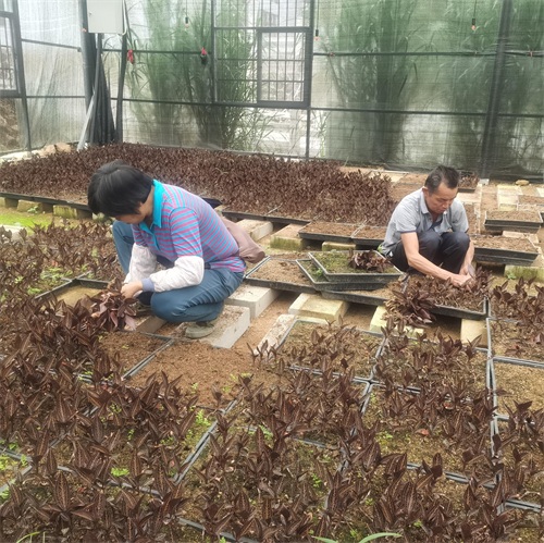 为了培育出高产、优品质的公石松,福建裕健龙生态农业有限公司创始人叶宗健投入100多万元,搭建基地大棚,购进室内栽种所需的方格盘、照明灯和空调,并请来福建农科院的专家,使用试管进行组织培养,用无菌培养技术产生公石松的药用成分,在无菌、宜生的人工培养基及合适的光照、温度等条件下,诱导出愈伤组织、不定芽、不定根,再把试管内的组培苗经过洗苗、炼苗等步骤后移栽至温室。 “成功培育出公石松后,看到它们在大棚里长势良好、成活率高,我们也放心地把这些培育出来的公石松移至林下种植,目前基地里共种植200亩的公石松,按照今年的市场价,产值能达到300多万元。”裕健龙中药材基地创始人叶宗健介绍道。