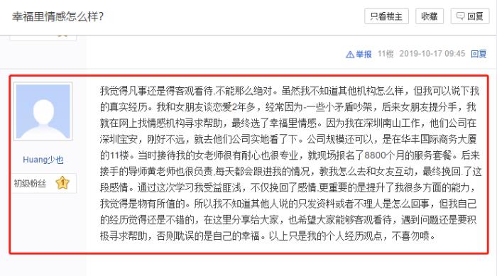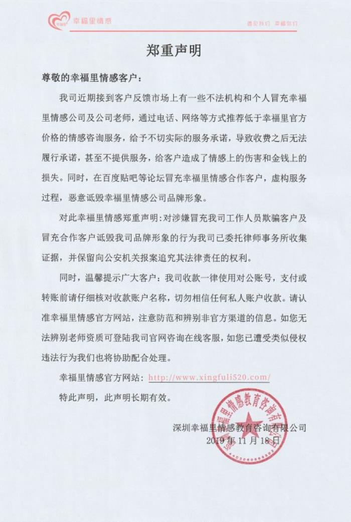 另外,也希望那些蓄意诋毁幸福里情感的不法分子,请停止这种不道德的竞争行为,请摆正三观,切勿再乘人之危,给这些情感受到创伤的人们再增加伤口。以正当的手段进行合法竞争,为感情咨询行业打造和谐的发展环境。
