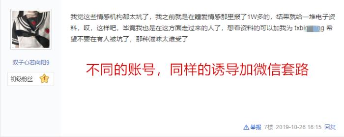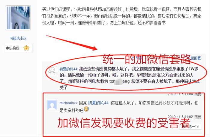接下来,这些不法机构再用"受害者"的身份,打着免费发资料等形式欺骗求助者加微信,最后以发资料的形式骗取求助者钱财,或转介绍其他所谓"帮自己挽回成功"的不良机构。