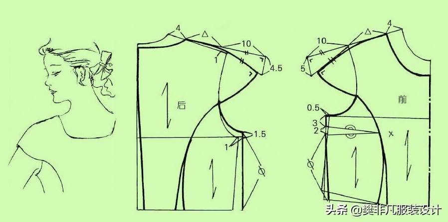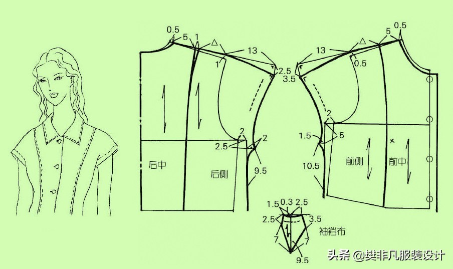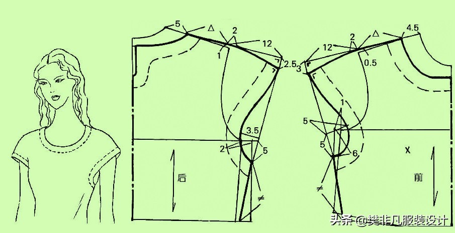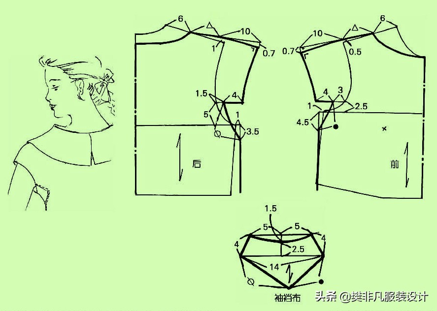 该袖型在肩部作育克设计,通过分割线进行收省,造成袖子的肩部具有倾斜度。(见下图)