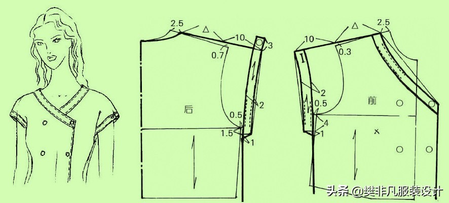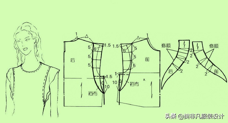 这是稍稍遮盖住肩膀的袖型。领圈和袖窿采用内加贴边的方法。(见下图)