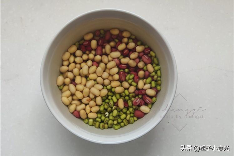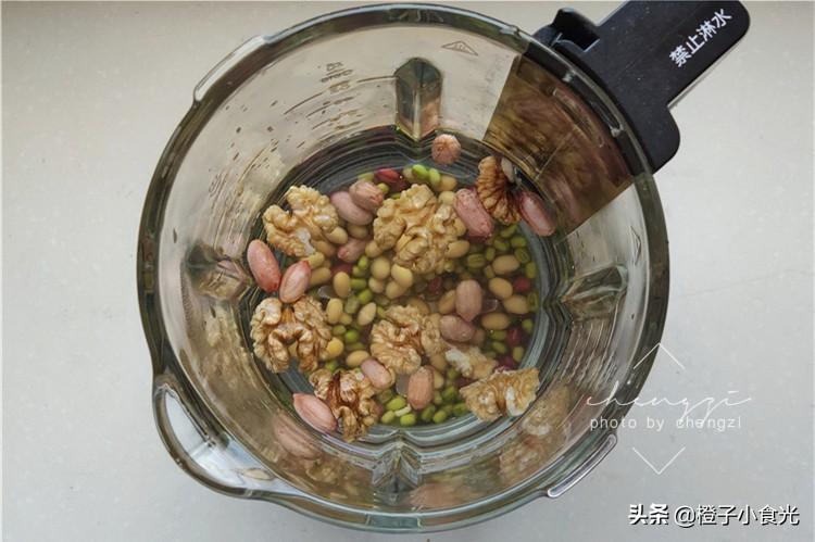 所用食材:黄豆25克,红豆25克,绿豆25克,核桃20克,花生15克,纯净水约900毫升