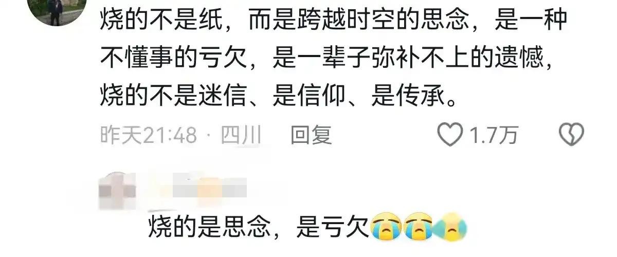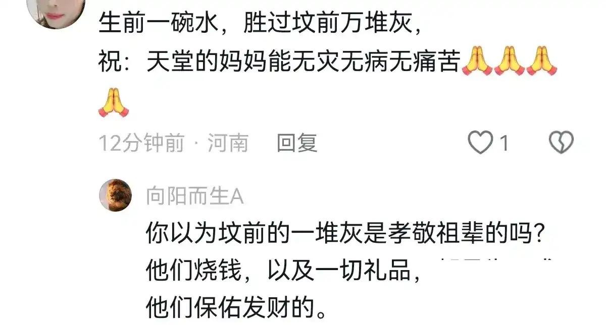 而网友们对于烧纸钱这种行为也肯定会存在者两种截然相反声音存在,并且每种声音背后都代表着这种声音所支持或者反对者的价值观所在!