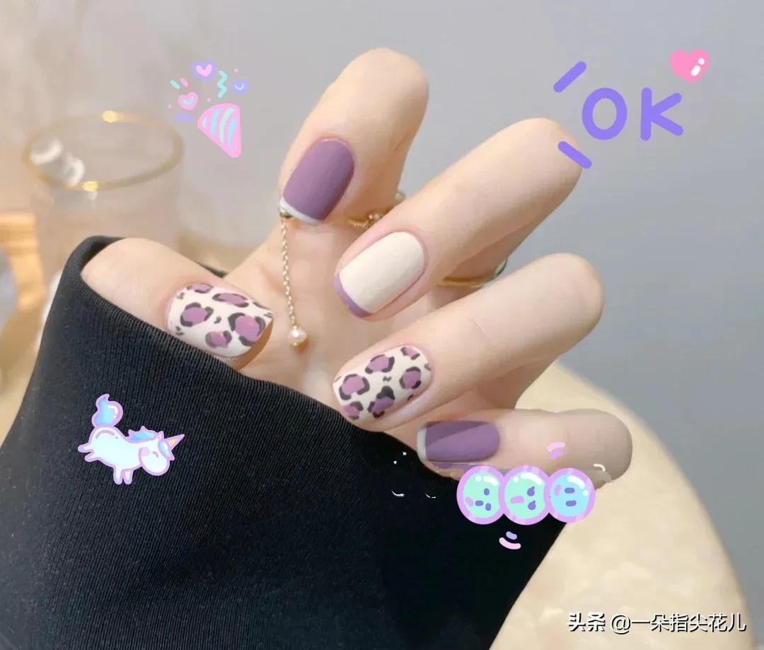 食指和小拇指香芋紫色+奶油白法式边。拇指和无名指奶油白+紫色豹纹。中指奶油白+法式边。可爱又个性的风格。