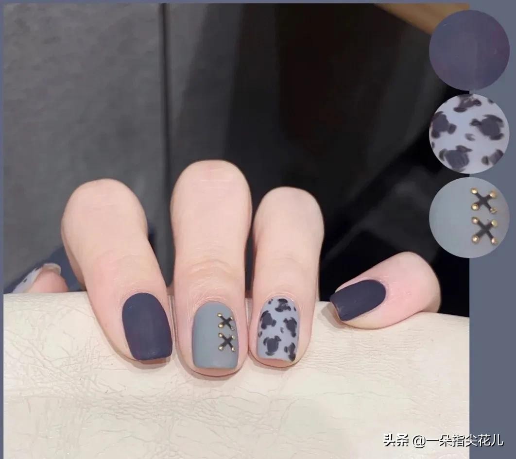 食指和小拇指雾霾蓝色系+中指灰色系+大拇指和无名指紫色豹纹彩绘。这一款做成磨砂效果,质感很好。