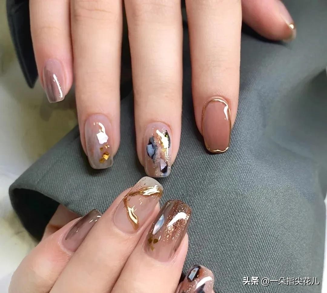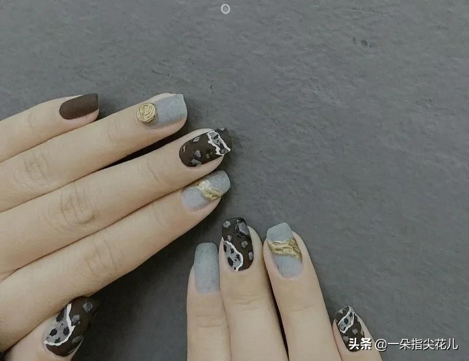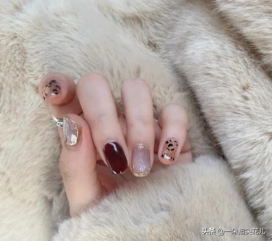 小姆手指和食指焦糖色系+金属法式边,无名指晶石猫眼搭配豹纹彩绘+中指焦糖色系浅色搭配贝壳片,大拇指可以和中指(无名指)同款。