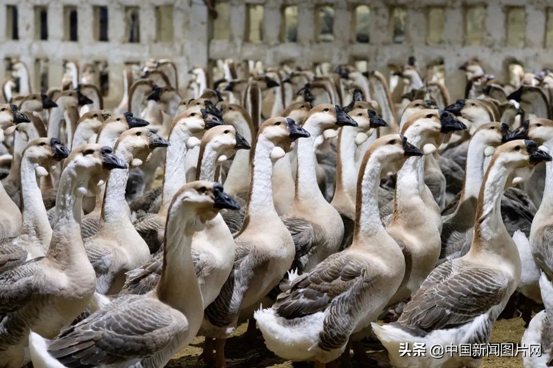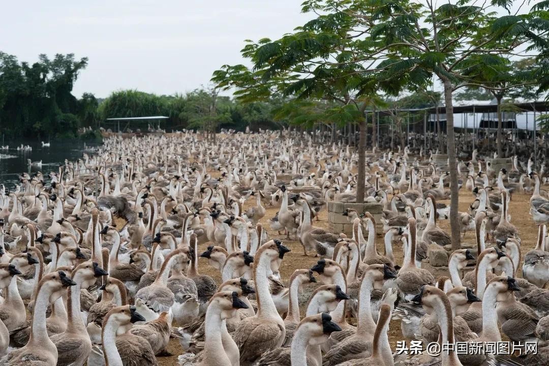 12月23日,广东省潮州市,成群的狮头鹅在养殖场活动。金涛种养专业合作社挑选的潜力公鹅参加2021年“鹅王大赛”前,在这里进行育肥。