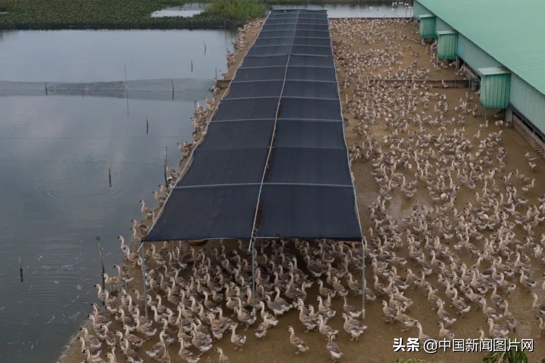 12月23日,广东省汕头市潮鹏生态养殖有限公司养殖的狮头鹅。(无人机照片)