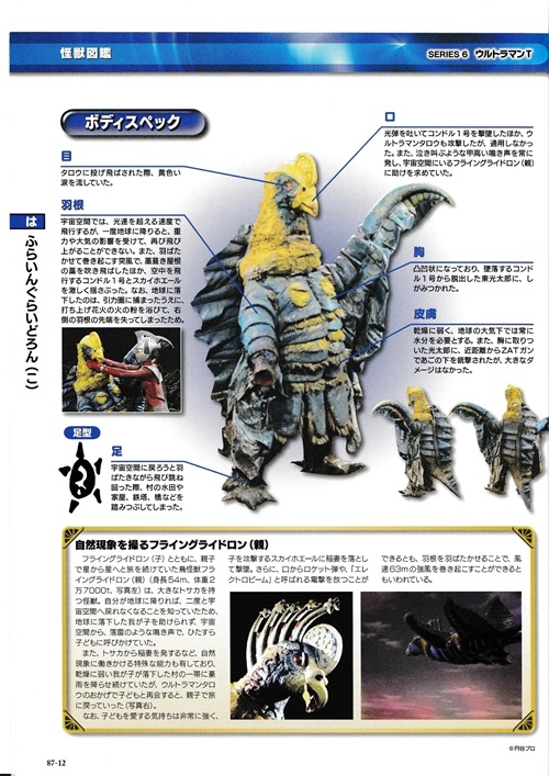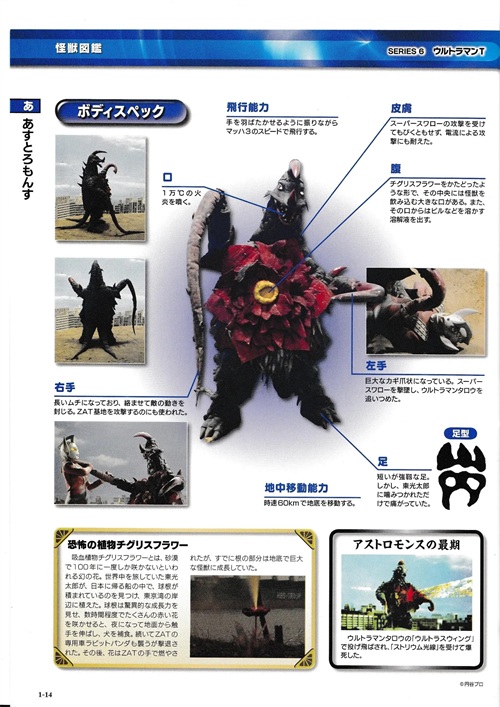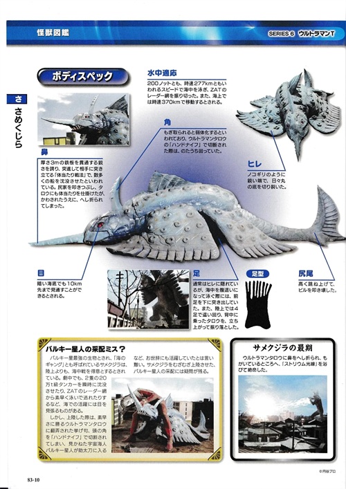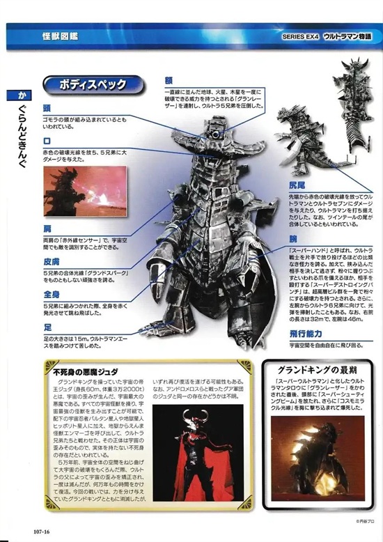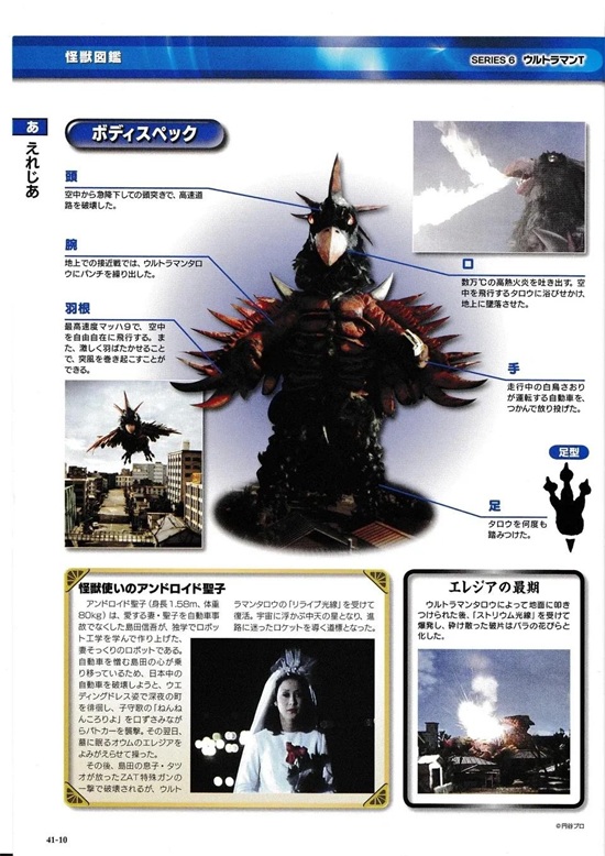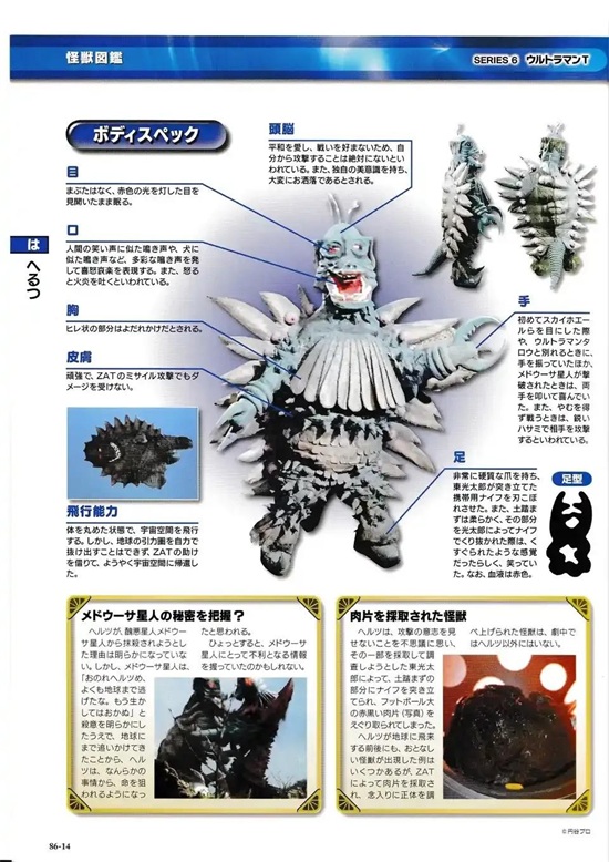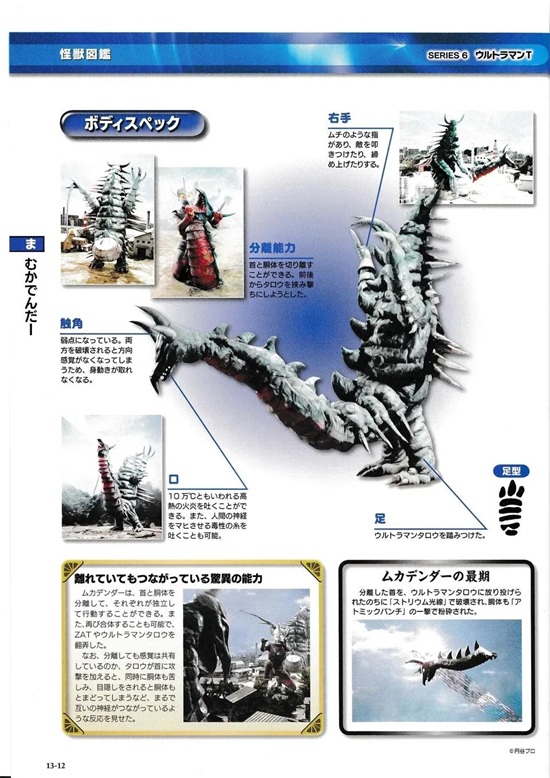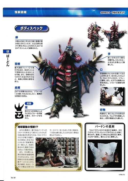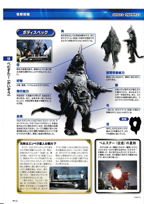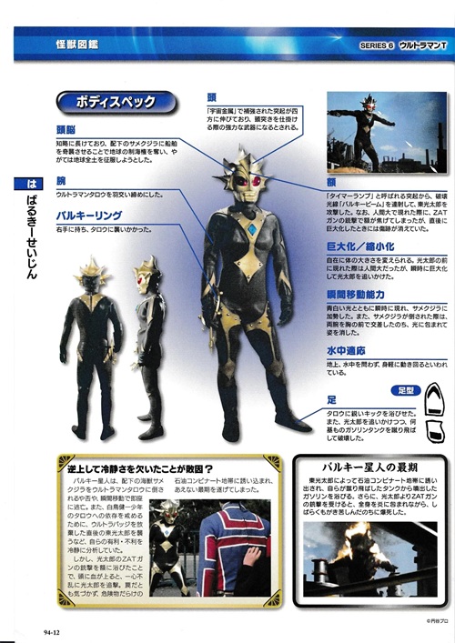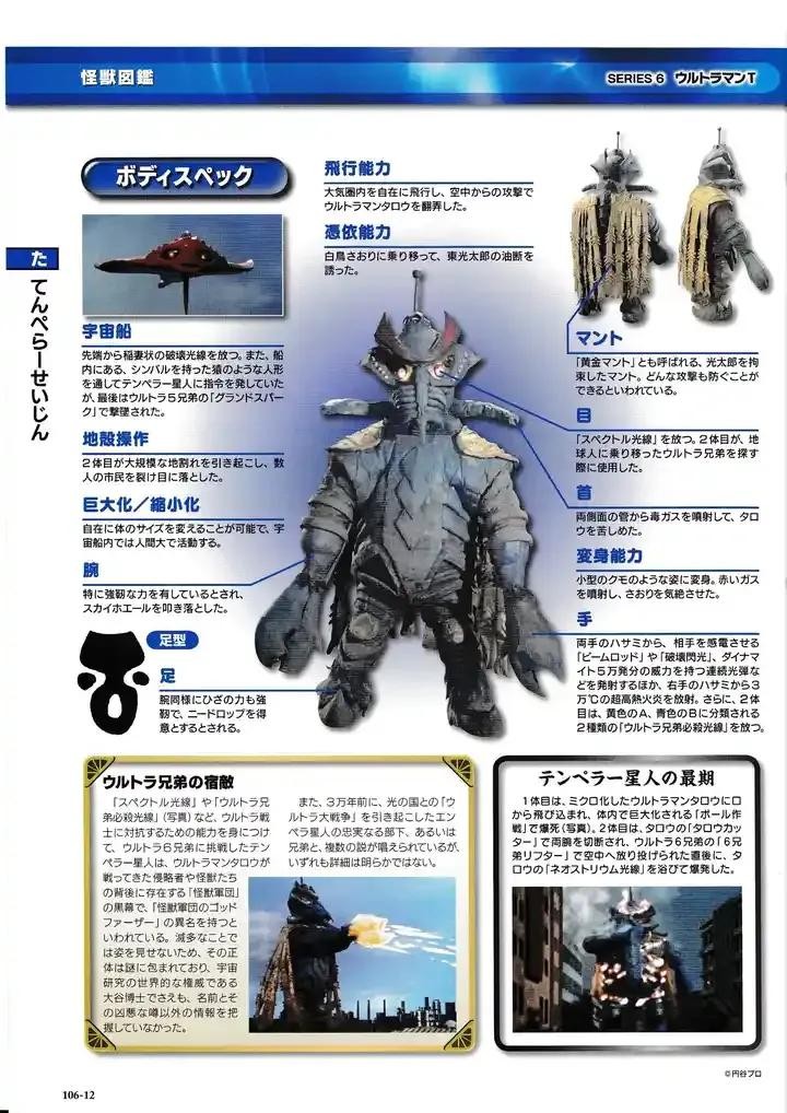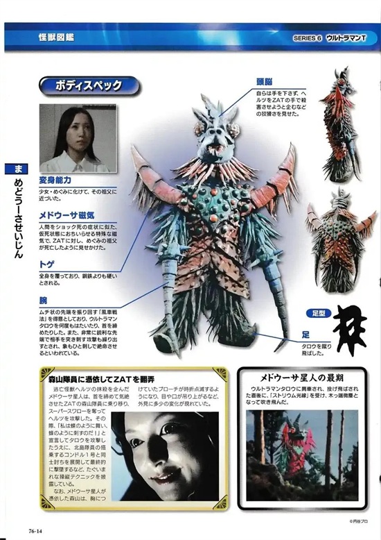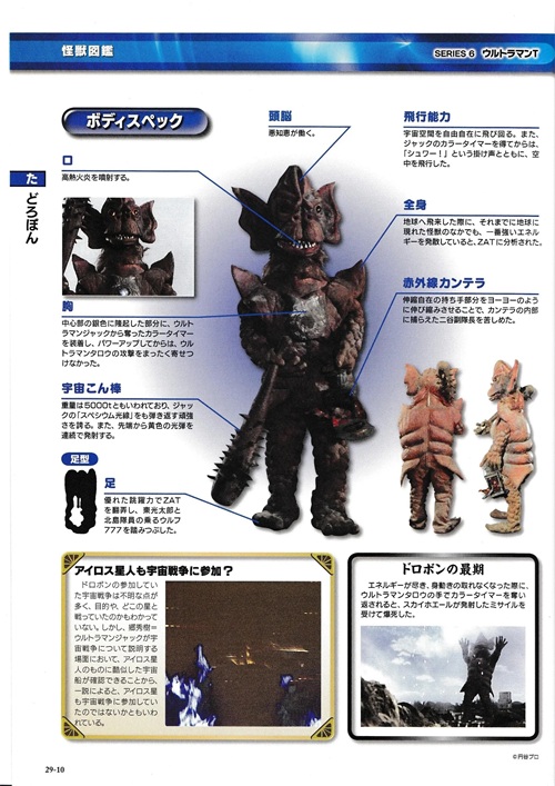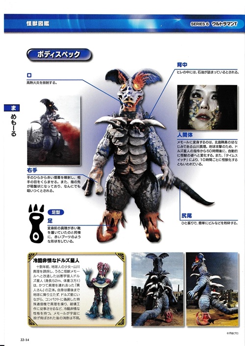 具备头和身体分离,合体、口中可以吐出雾状的毒丝和10万度的火焰等多种不同的能力,和泰罗对战时以身首分离活动的特殊能力一度让泰罗无措,最后因头上触角被破坏,失去平衡感,被泰罗消灭。
