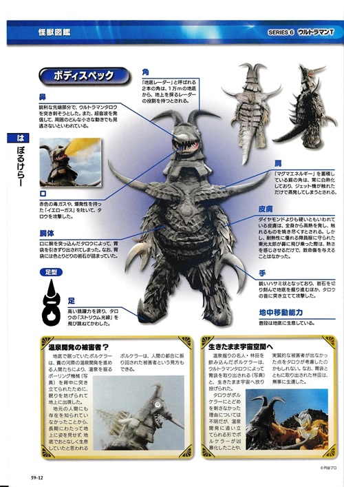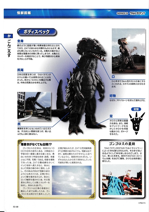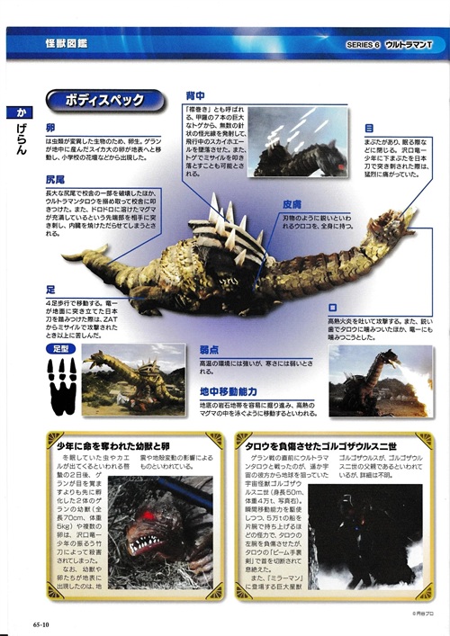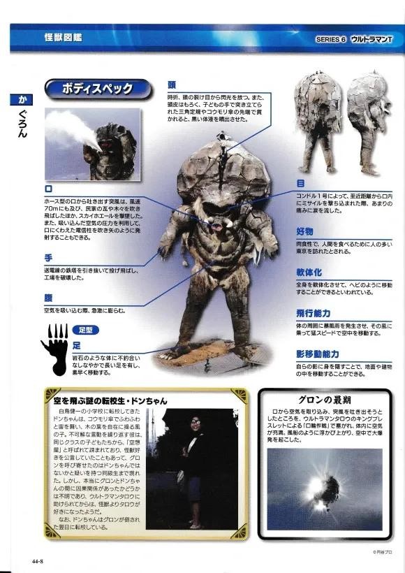 原本在地底沉睡,但是被温泉开发的钻井机刺中其背部而苏醒,愤怒地冲出地面。全身覆盖着坚硬的皮肤,以口中喷出的破坏性气体为武器,最后被泰罗送到宇宙。