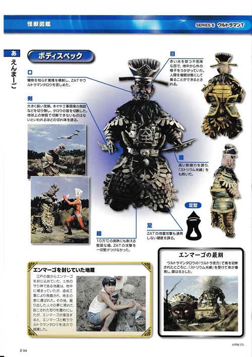 在古代被地藏王菩萨封印在地下的怪兽,但由于现代工事挖掘的破坏导致地藏菩萨像被取下、封印被破而复活。形象酷似阎魔王,身披甲胄,主要的武器是从口中吐出令植物枯萎的毒烟,还有一口足以斩下泰罗首级的巨大宝刀,盾牌更能抵挡泰罗的光线,战斗中地藏菩萨施以援手,用法力束缚了恩马戈,使其无法行动。趁此时机,泰罗用「奥特念力」切断了恩马戈的首级,再用斯特利姆光线炸毁了恩马戈的躯体,恩马戈最终被消灭。