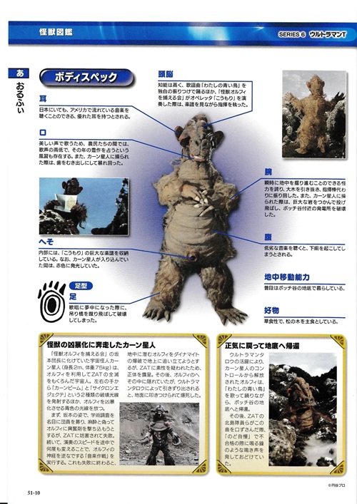 爱好歌唱的怪兽,居住在秩父地区的波奇谷一带,深受附近居民的喜爱;一年出现一次,每当其进行歌唱时,周围的农民们都会根据奥尔菲的歌声来预测今年的农作物收成。虽然拥有怪力但却厌恶纷争,性格温和友善。一度被卡恩星人控制而凶暴化,最终在泰罗奥特曼的帮助下恢复正常,回到山谷生活。
