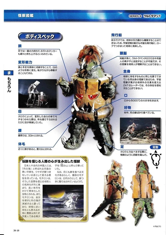 传说在月亮上有兔子舂年糕,于是向月亮供奉团子,人们的心情传到月亮上,形成的怪兽。木臼状的脸上附有手足,能说话,口吐高温火焰,同时还有将四肢和头顶尾巴收入身体中冲击破坏的「臼车」作为武器,最后与南夕子和奥特之父回到月球。