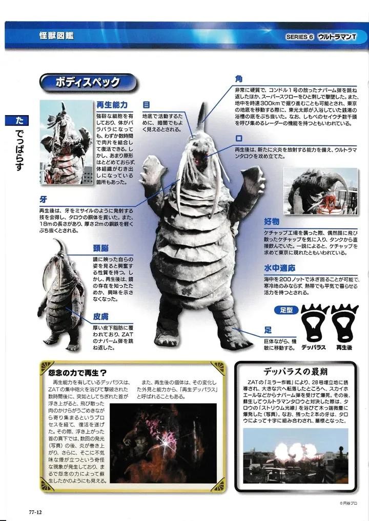 由海象变异而成的怪兽,一直在海底活动,苏醒之后从海底寻找出口而钻到东京地底,喜好吞食番茄酱。一度因为ZAT的攻击而被炸死,但在强大的再生能力作用,重组四分五裂的身体而后复活。再生德帕拉斯以火焰放射和导弹獠牙的攻击一度令泰罗受挫,但最终败给了泰罗,并被「斯特利姆光线」炸得粉碎。德帕拉斯残存的2根獠牙,被泰罗组合成了十字状,作为德帕拉斯的墓碑。
