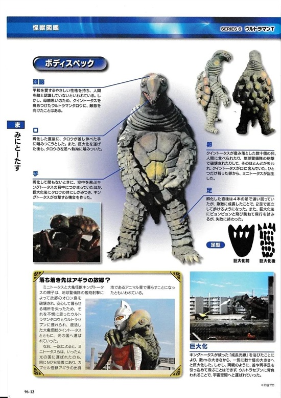 欧隆岛的巨龟怪兽托塔斯王夫妇的孩子,从被夺走的龟蛋中孵化出生。被父亲的成长光线巨大化后,向着打倒其母的泰罗奥特曼发动攻击。最后随着父母一起被赛文奥特曼带走前往光之国。
