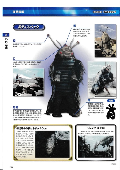 喜好吞食某种特殊宝石的怪兽,从古埃及时代就已经存在,被称为恶魔。能从口中吐出溶化一切的强力溶解液。最开始是一条鼻涕虫大小,在受到ZAT的攻击后巨大化为怪兽,以溶解液与长舌攻击为武器,和泰罗展开对决。吉连玛以强酸溶液的攻击一度压制了泰罗;但在ZAT释放强碱液中和了强酸后,吉连玛的溶解液失去了威胁性,遭到泰罗的格斗压制。在头部的触角双眼被拔断、长舌被泰罗用「蓝色镭射」烧断后,吉连玛失去了能和泰罗对抗的全部手段,最终被泰罗的「斯特利姆光线」消灭。