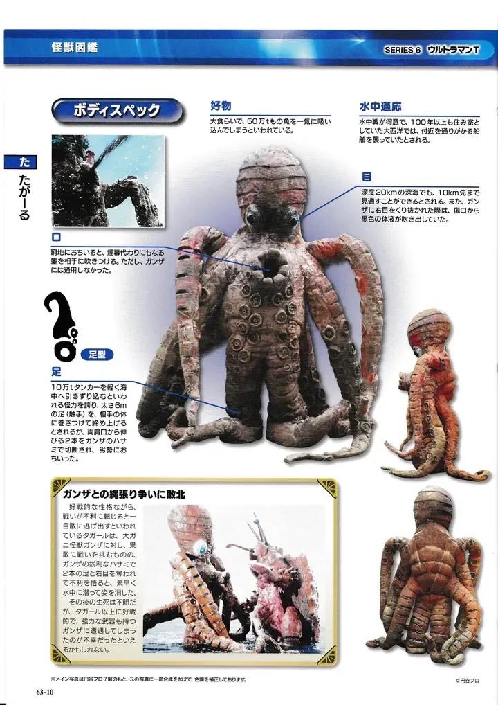 在太平洋内出生、向日本近海中移动的巨大章鱼怪兽,为了争夺地盘而与螃蟹怪兽甘扎对决,但被甘扎打瞎一只眼、斩断两条触手,而后逃之夭夭。