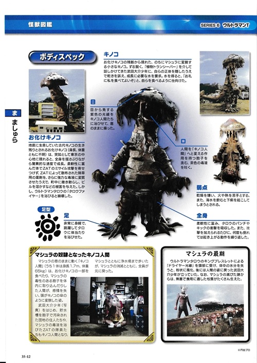 在东京突然出现的古代泥盆纪的妖怪蘑菇被焚化后的残存体,在寄生于人体和吸收大量水分后怪兽化的姿态。通过潜入供水塔内释放毒液,将住宅区的人类变为蘑菇人,并通过眼中的特殊光线随意控制。拥有高度的智慧和野心,企图将全人类同化后进行支配,最后在和泰罗奥特曼的战斗中被消灭。