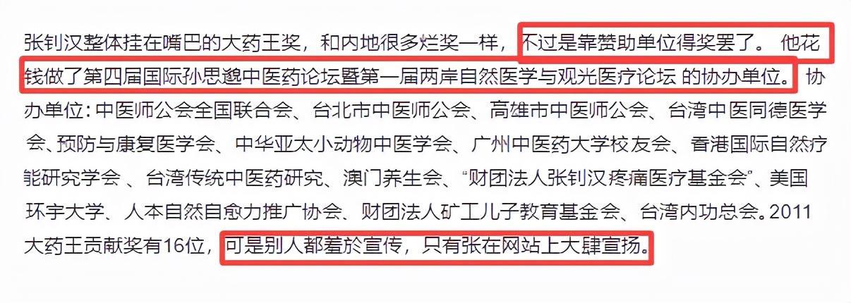 而张钊汉口中所说的“大药王奖”,也被扒出来是注水量极大的“烂奖”。网上搜索不到其他药王的信息,赞助合作单位不过是一些民间团体,只要交6000新台币,就可以随便申请“国际十大医王”“国际十大名医”“国际十大药王”……