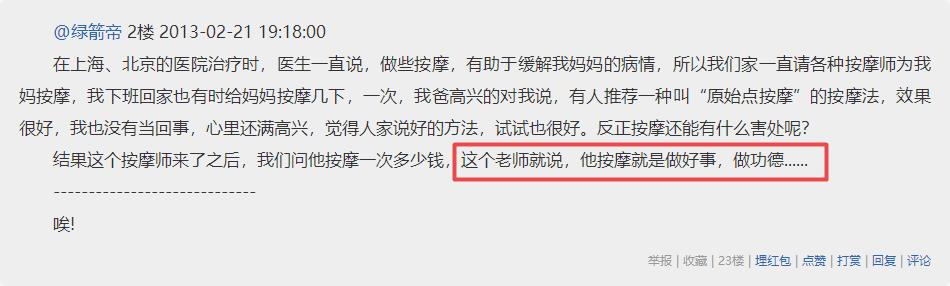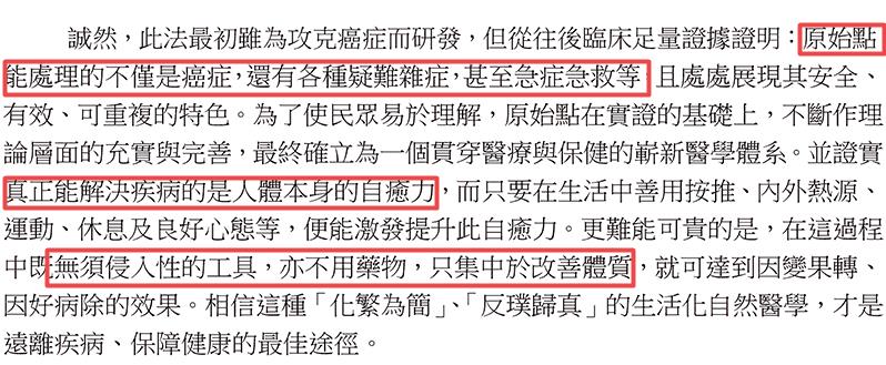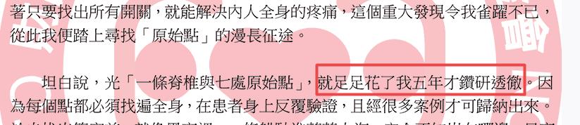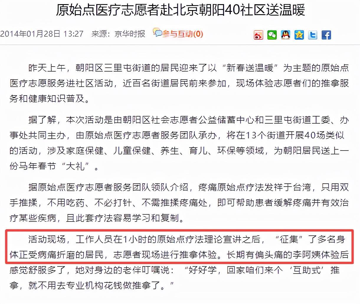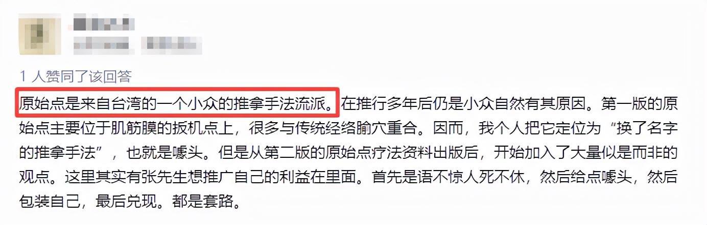 就连他的“原始点疗法”也不是他所说的,历时5年精心研究所得的,而是来自台湾省一个小众的推拿手法流派,加上自己的“包装”,成了自己的原创,并包治百病。