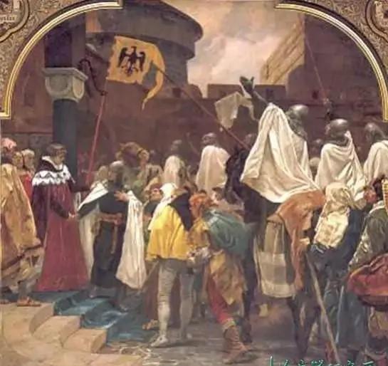 可惜腓特烈一世没坚持到底,半路掉河里淹死了,他的儿子施瓦本公爵继承遗志,继续带队东征。他们这一路走的是陆路,一路打仗,损失惨重,攻占巴勒斯坦的阿卡城后,为了照顾伤患人员,一伙人成立了一个行善的医护组织,这个组织就是后来的条顿骑士团,现在就先称之为条顿骑士团吧。
