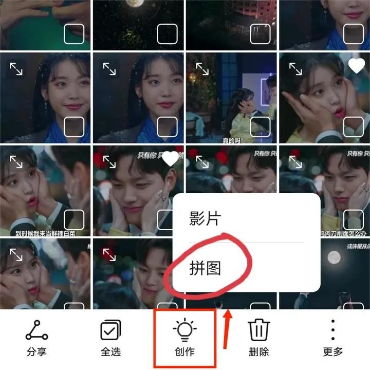 首先打开相册,长按相册中的照片,点击【创作】中的【拼图】,之后确定模版,保存即可~